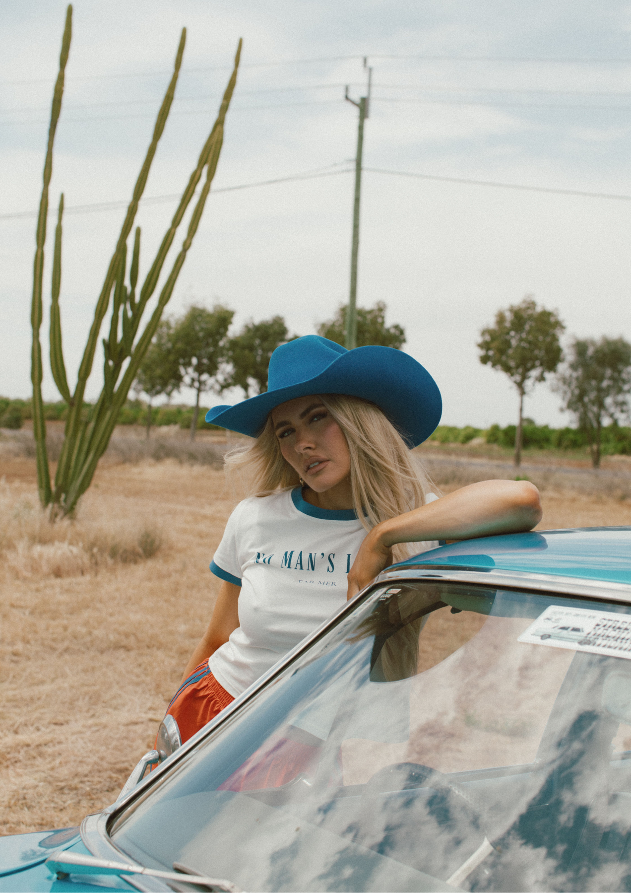 A classic baby tee in crisp white, cut for a close fit with blue contrast ribbing at the neck and sleeves. Across the chest, a token No Man’s Land FAR MER print—subtle, iconic, and easy to wear.