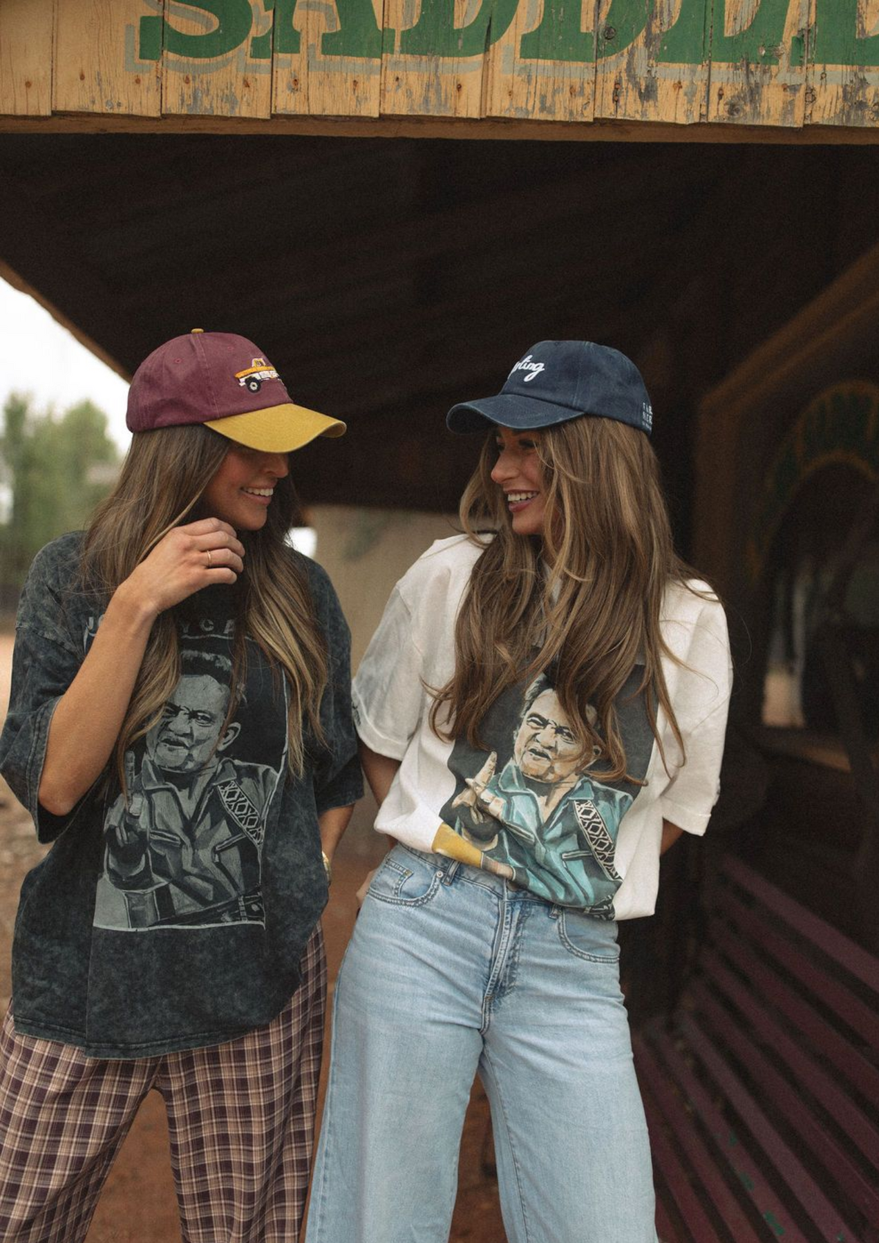 Hand painted truck design embroidered on vintage wash crimson cap with adjustable brass look strap, featuring contrast mustard wash brim.