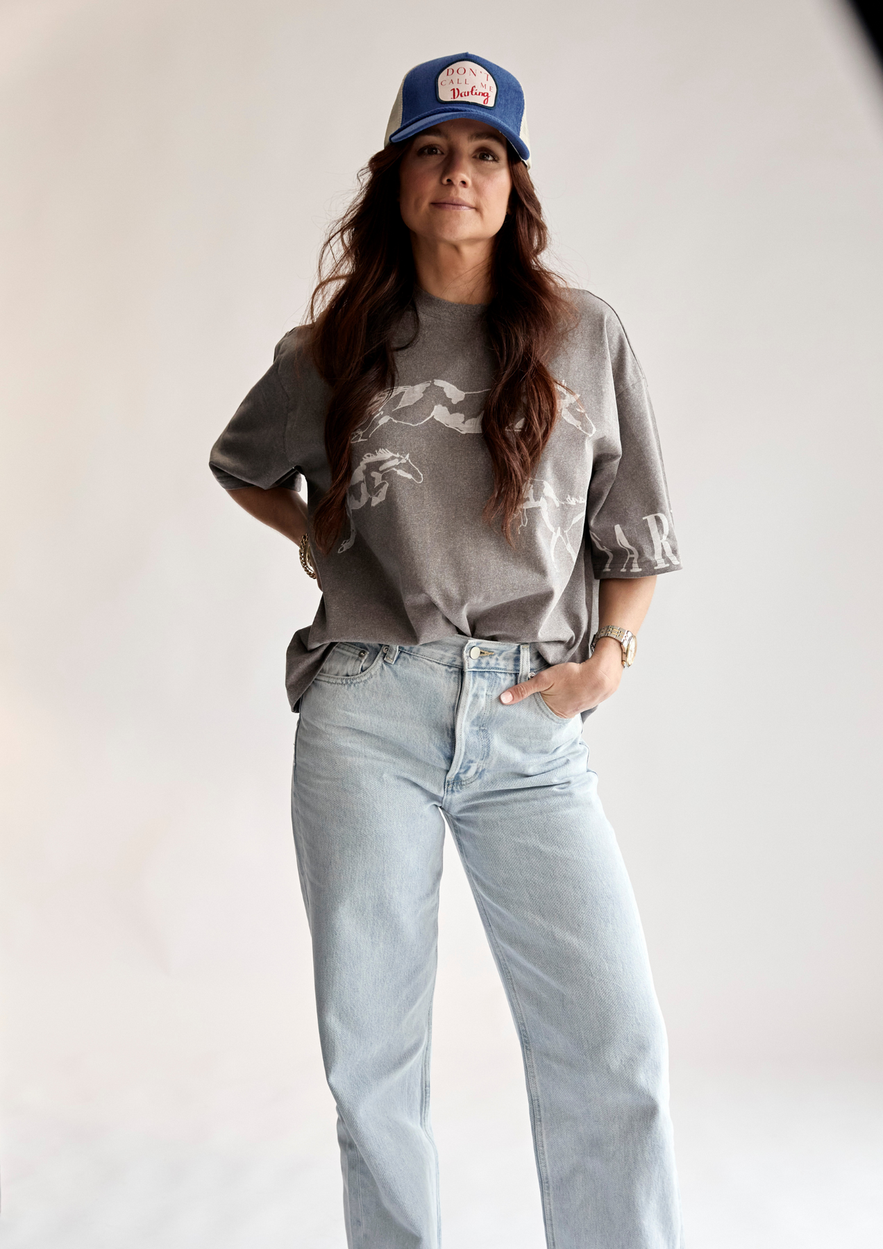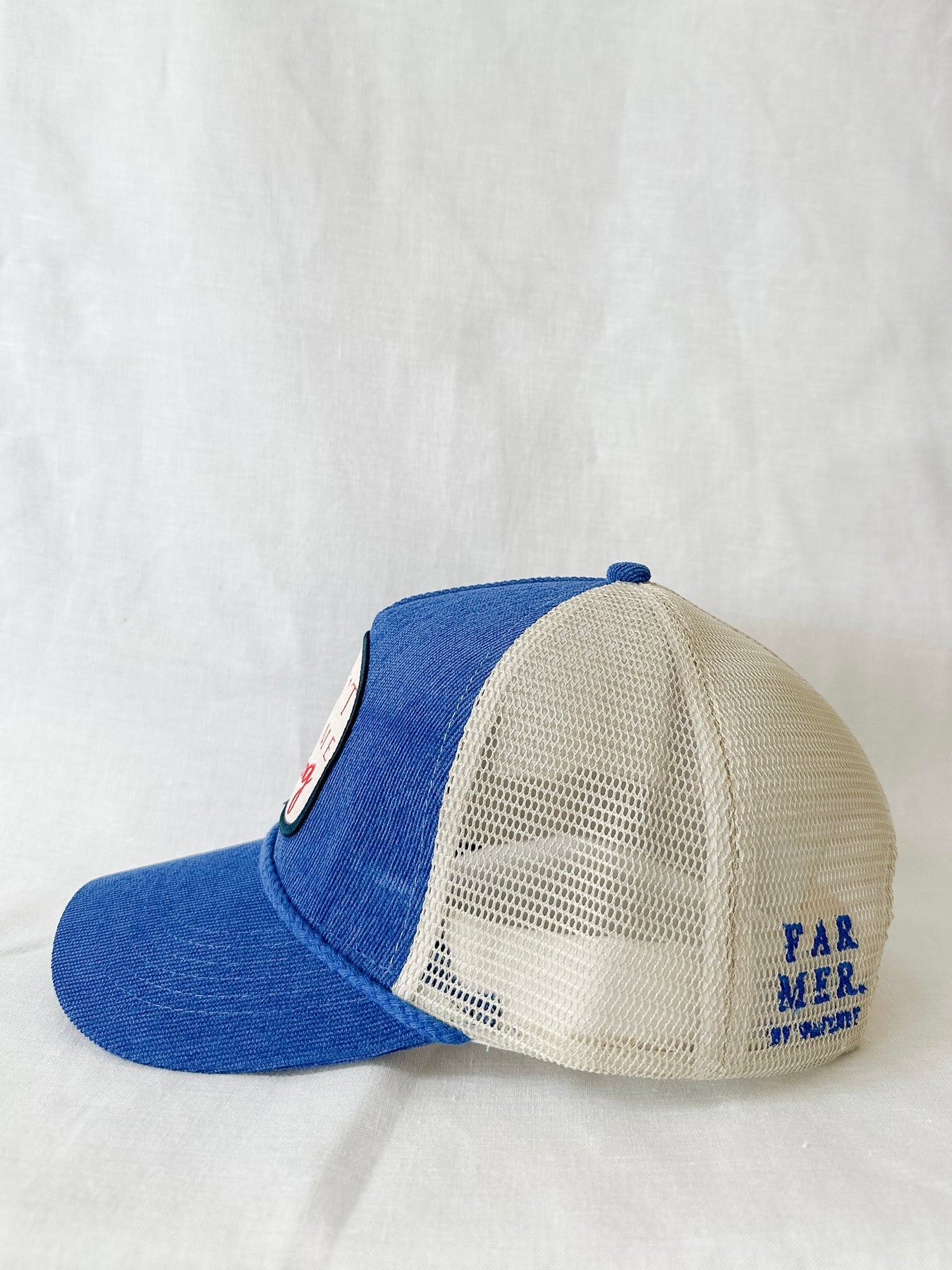 Embroidered patch on blue cotton with adjustable snap back, beige mesh.
