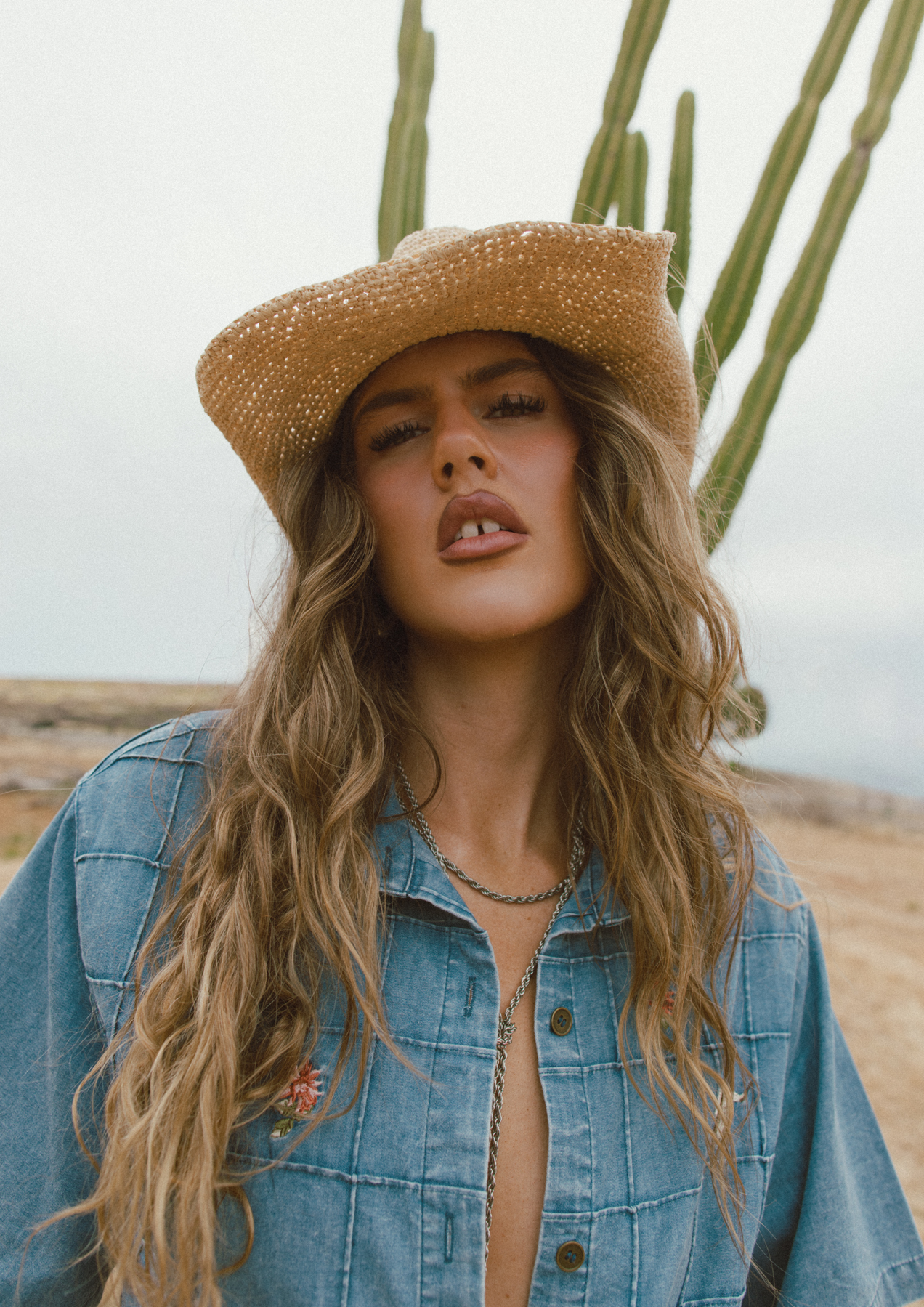 A collared button-down shirt with a denim-look base and embroidered desert motifs drawn from Whitney Spicer’s hand-painted works. Brass-look buttons run down the front, mirrored by removable brass-look collar tips that add a subtle western edge.
