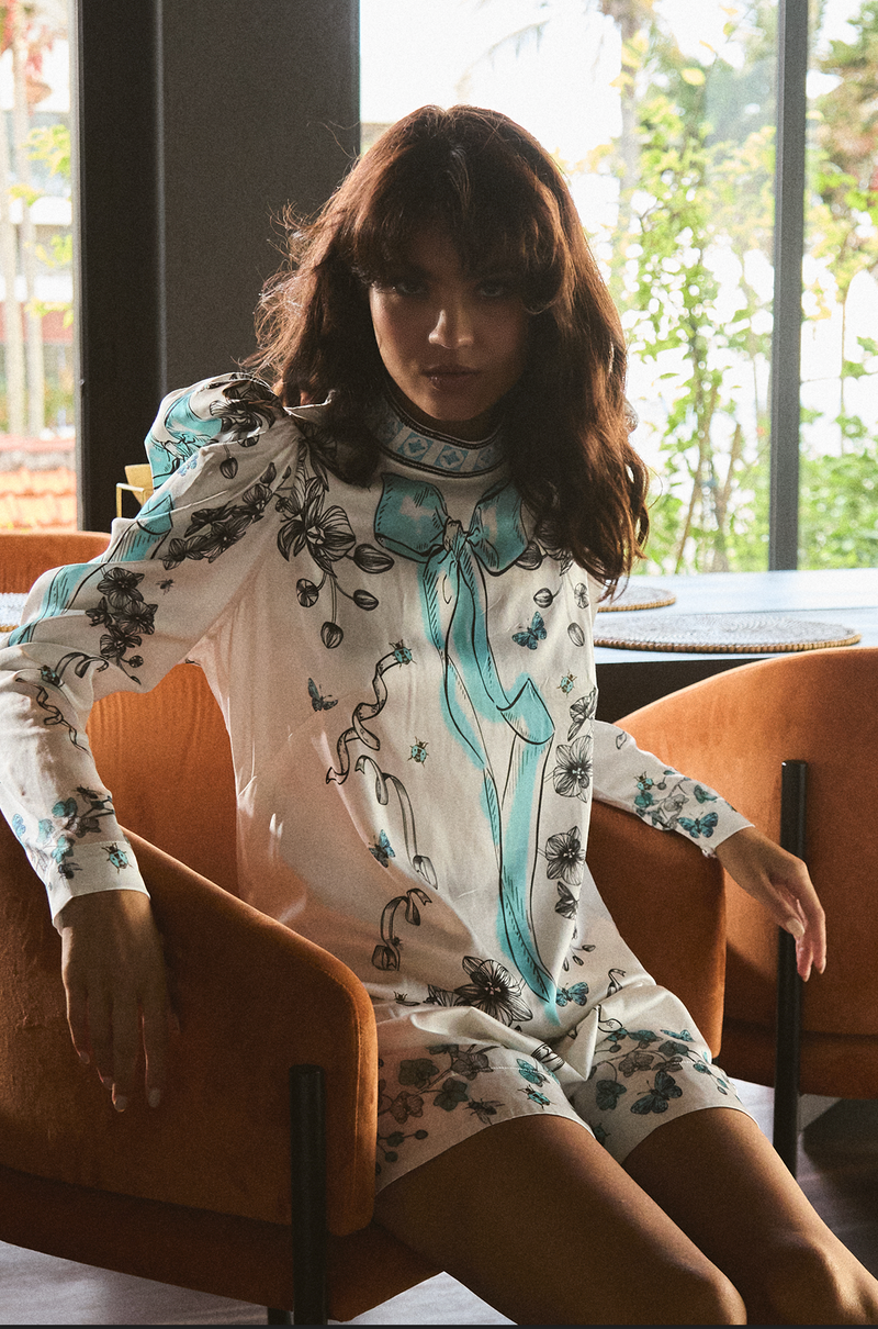 Playful glamour meets effortless elegance in the Hollywood Mini Bows. Designed in a relaxed silhouette, this mini dress offers comfort without compromising on style. The print showcases exquisite hand-drawn bows, accented with whimsical turquoise ladybugs and delicate scroll motifs, bringing a touch of fantasy to the design.
