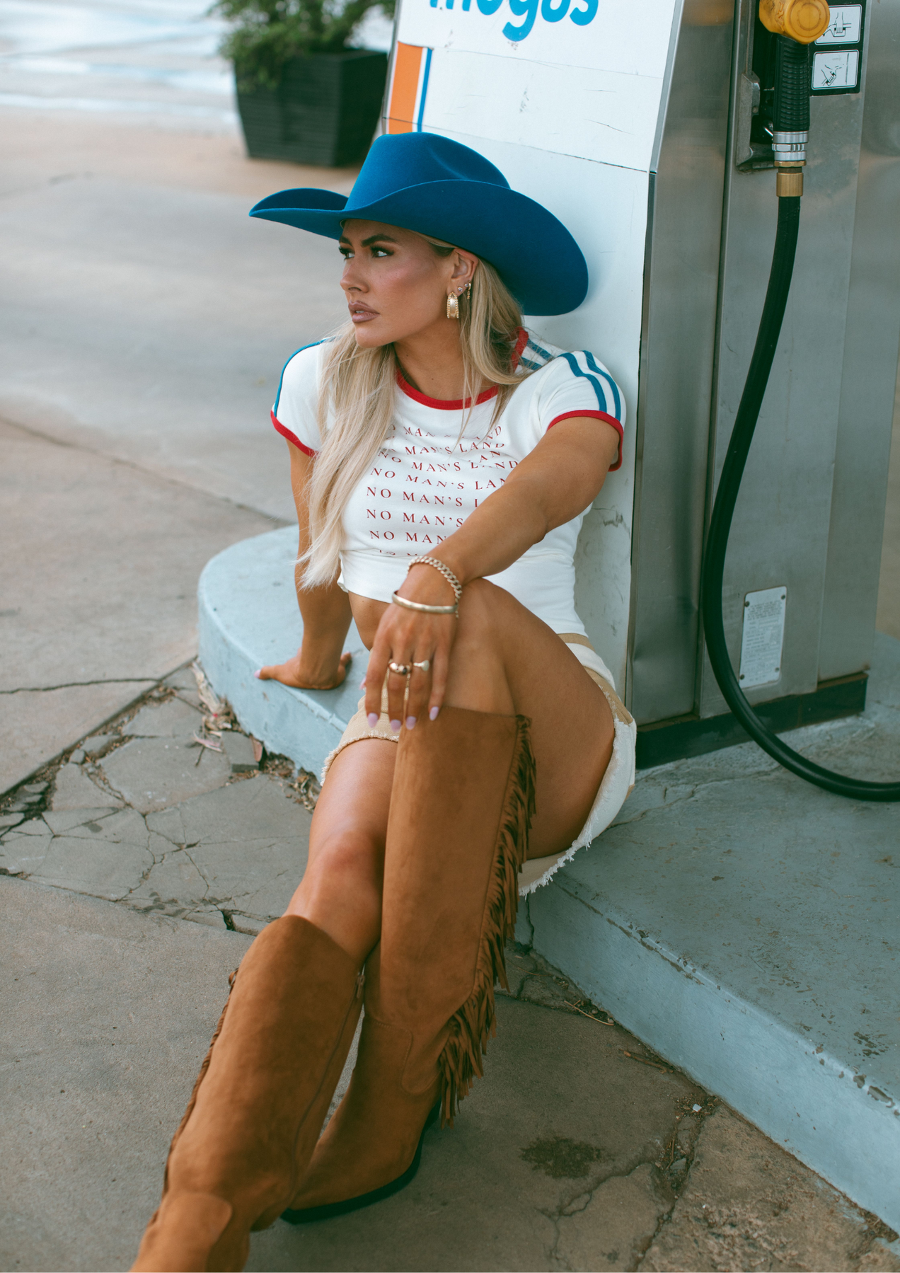 A form-fitting baby tee in soft off-white cotton, designed with contrast neck and sleeve ribbing and a double-stripe sleeve detail. Down the front, the No Man’s Land title repeats like a mantra—bold, unapologetic, and unmistakably FAR MER.