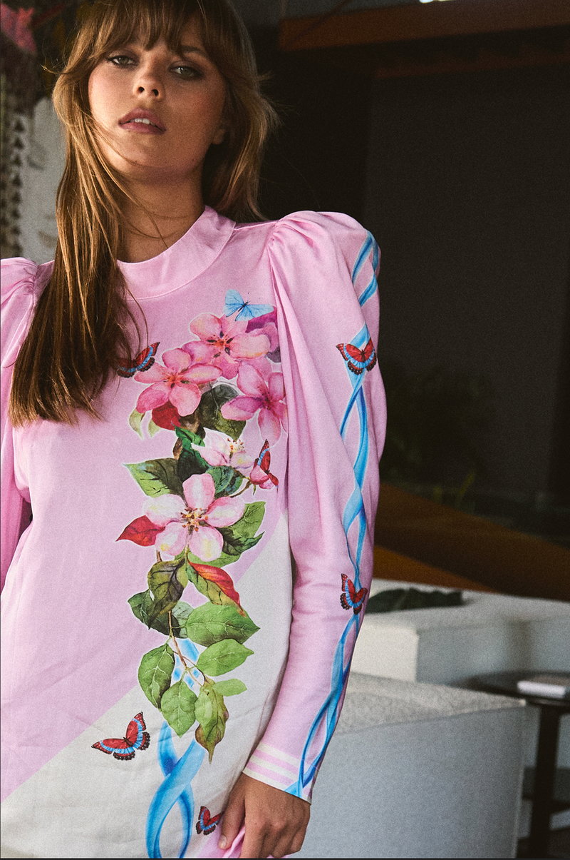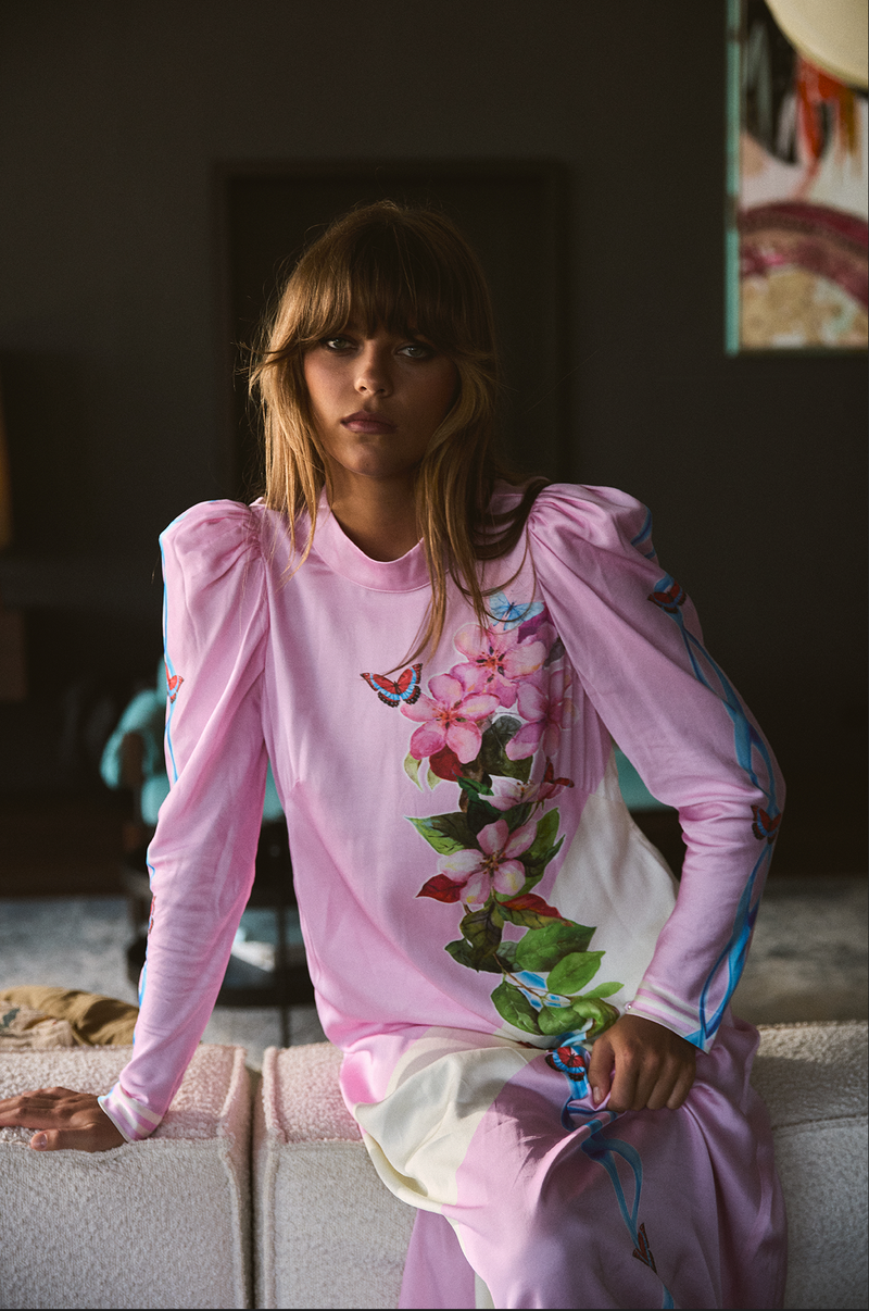 Evoke the romance of endless summers in the Santorini Maxi Butterfly. Set against a soft pink and white backdrop, this statement piece features an oversized print of vivid red butterflies and sweeping leafy accents—an ode to nature’s beauty with a modern twist.