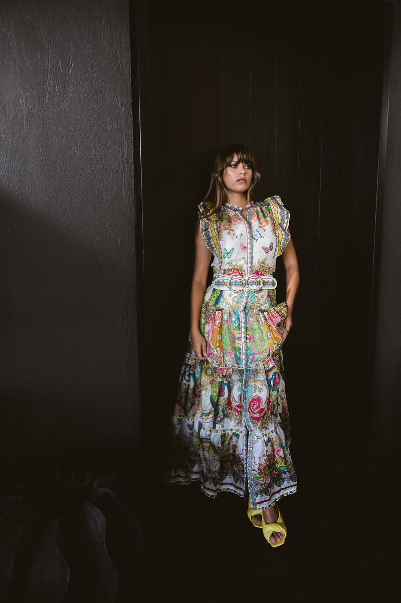 Ethereal and artfully detailed, the Starbright Maxi Angelic dress is a vision of romantic craftsmanship. Made from soft, flowing silk ramie fabric, it features detailed hand painted florals and ornate scrolls that dance across the skirt, while a delicate butterfly print graces the bodice, adding a whimsical touch. The butterfly-shaped sleeves flutter gently, echoing the dress's lightness and grace. Each tier of the voluminous maxi skirt is finished with fine gathered ruffles, creating texture and movement. An adjustable belt cinches the waist for a tailored fit, and a full lining ensures luxurious comfort. This is a dress designed for moments that feel like magic.