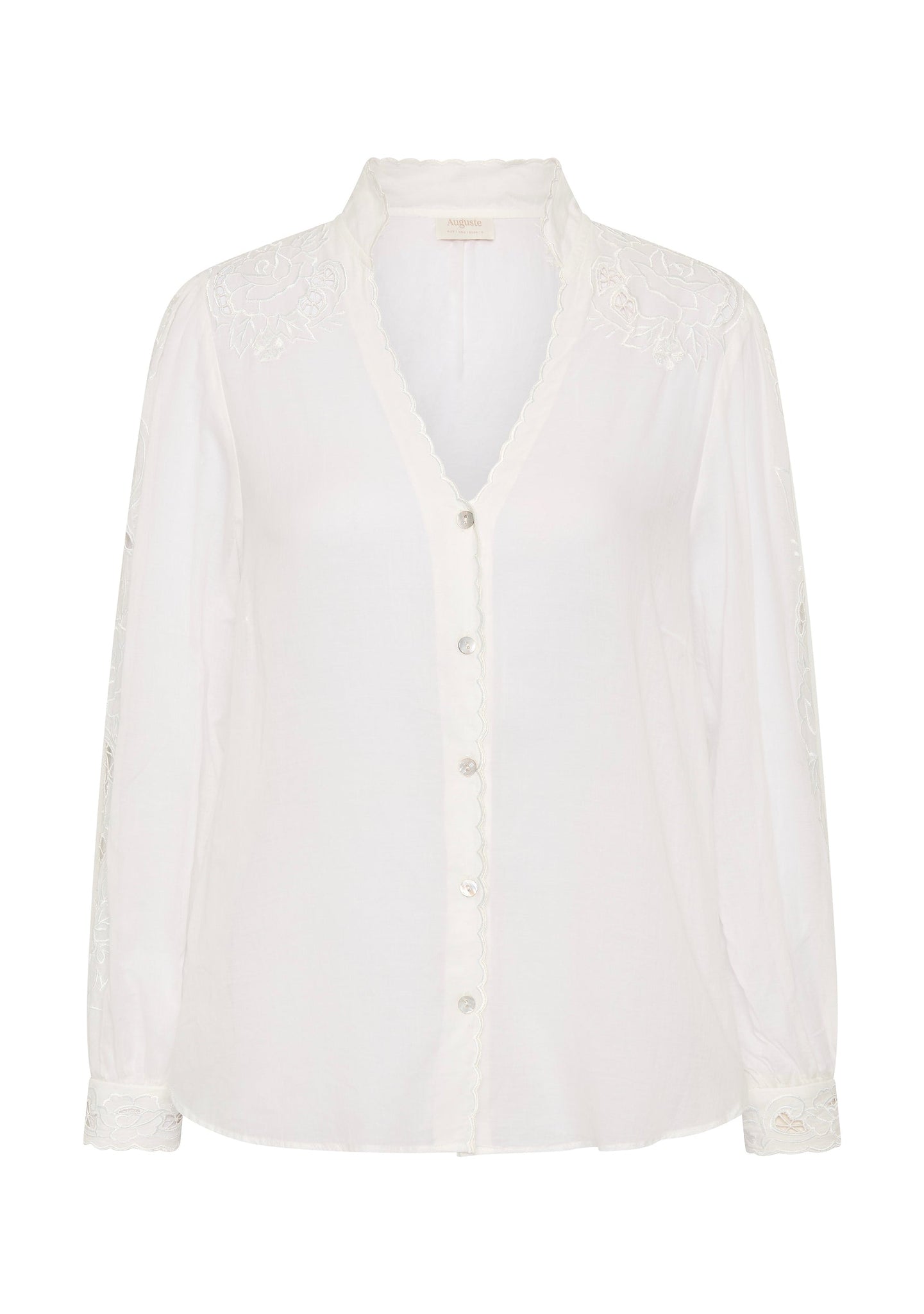 The Talia Blouse in warm white is crafted from soft, lightweight cotton with a semi-sheer finish and natural drape. Designed with a refined mandarin collar and flattering V neckline, it features a button-front closure and long blouson sleeves adorned with intricate, abundant embroidery that trails down the arms — the true statement of the piece. Hand-embroidered by our talented artisans, Talia is a true celebration of craftsmanship. Made form 100% cotton.